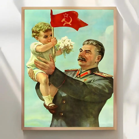 Affiche propagande soviétique iconique : Staline tenant un enfant avec drapeau rouge et bouquet, image du père de la nation. Pièce de décoration iconique pour amateurs d'histoire soviétique et de l'URSS, idéale pour un salon, un bureau ou une chambre au ton affirmé.