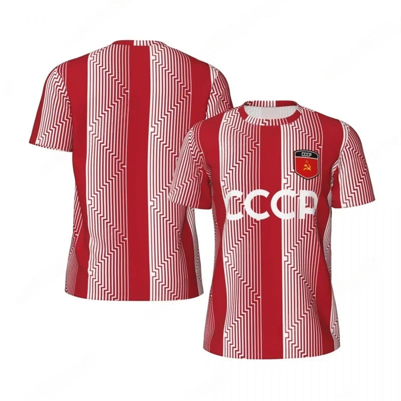 Le motif à rayures géométriques rouges et blanches donne à ce maillot un style rétro-futuriste unique. L’écusson soviétique, associé à l’inscription CCCP, renforce son identité révolutionnaire et emblématique. Ce modèle est parfait pour imposer un look distinctif, engagé et dynamique sur le terrain comme au quotidien.